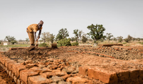 Les briques en terre crue sont fabriquées directement sur le site à partir de la terre locale, sechées au soleil.